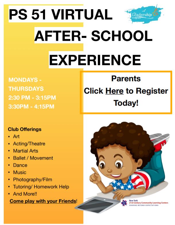 PS 51 invites you to join our After-School virtual experience! Here is our flyer with the available dates, time slots and club offerings!
